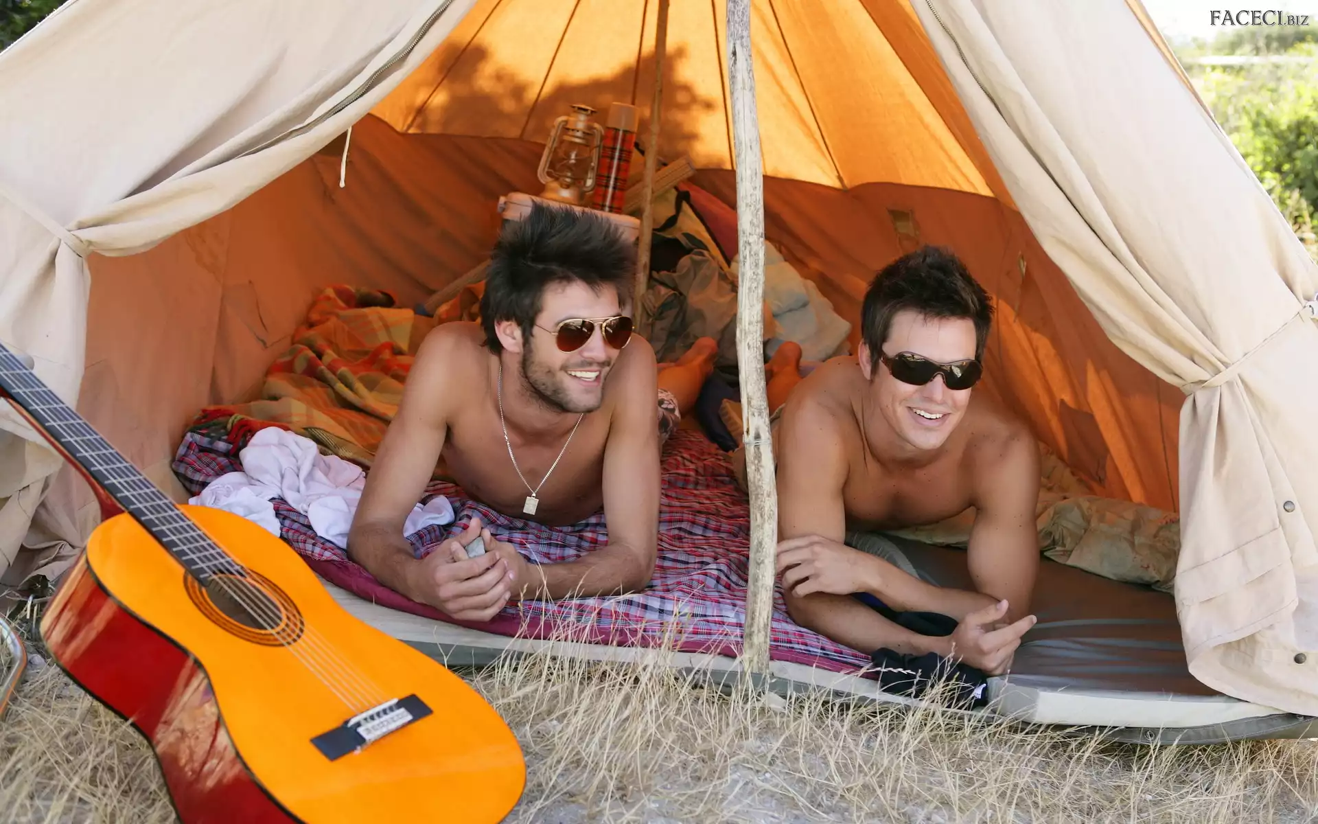 Okulary, Uśmiech, Namiot, Mężczyźni, Gitara - faceci.biz